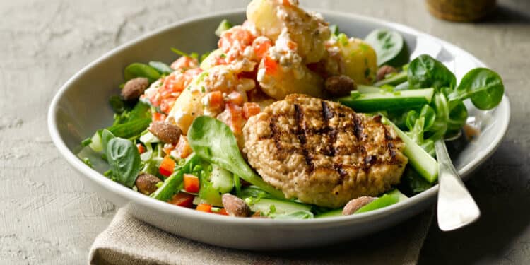 Kyllingehakkebøffer med kartoffelsalat med hytteost og røgede mandler